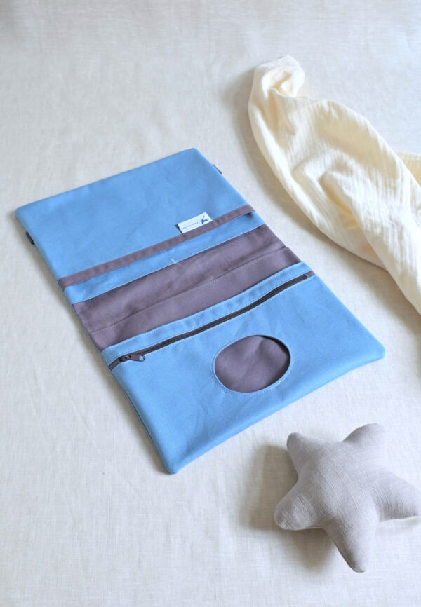 Plenkovník je ušitý v nadčasovém minimalistickém vzhledu ze 100% bavlny vyšší gramáže v modro-šedé barevné kombinaci.