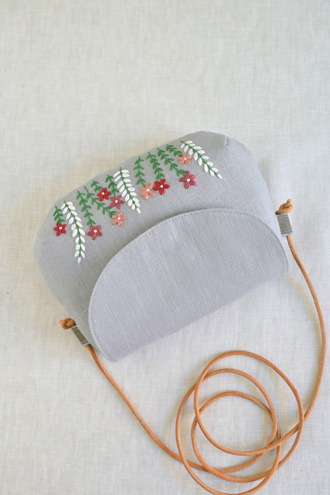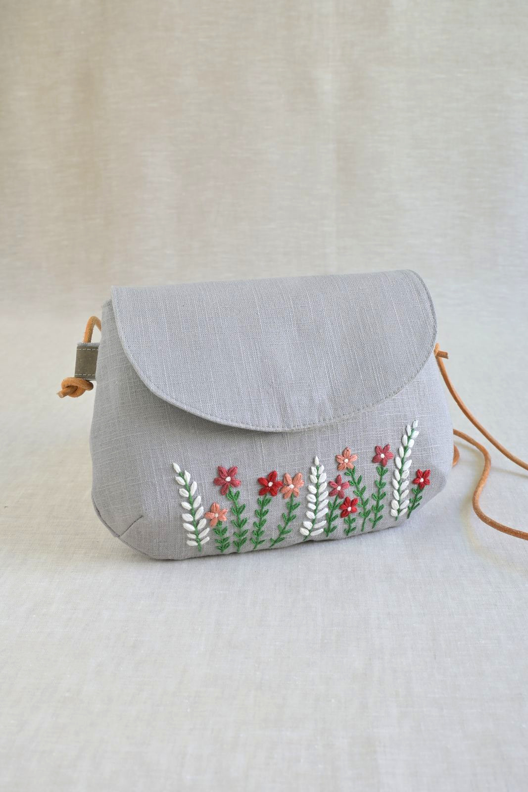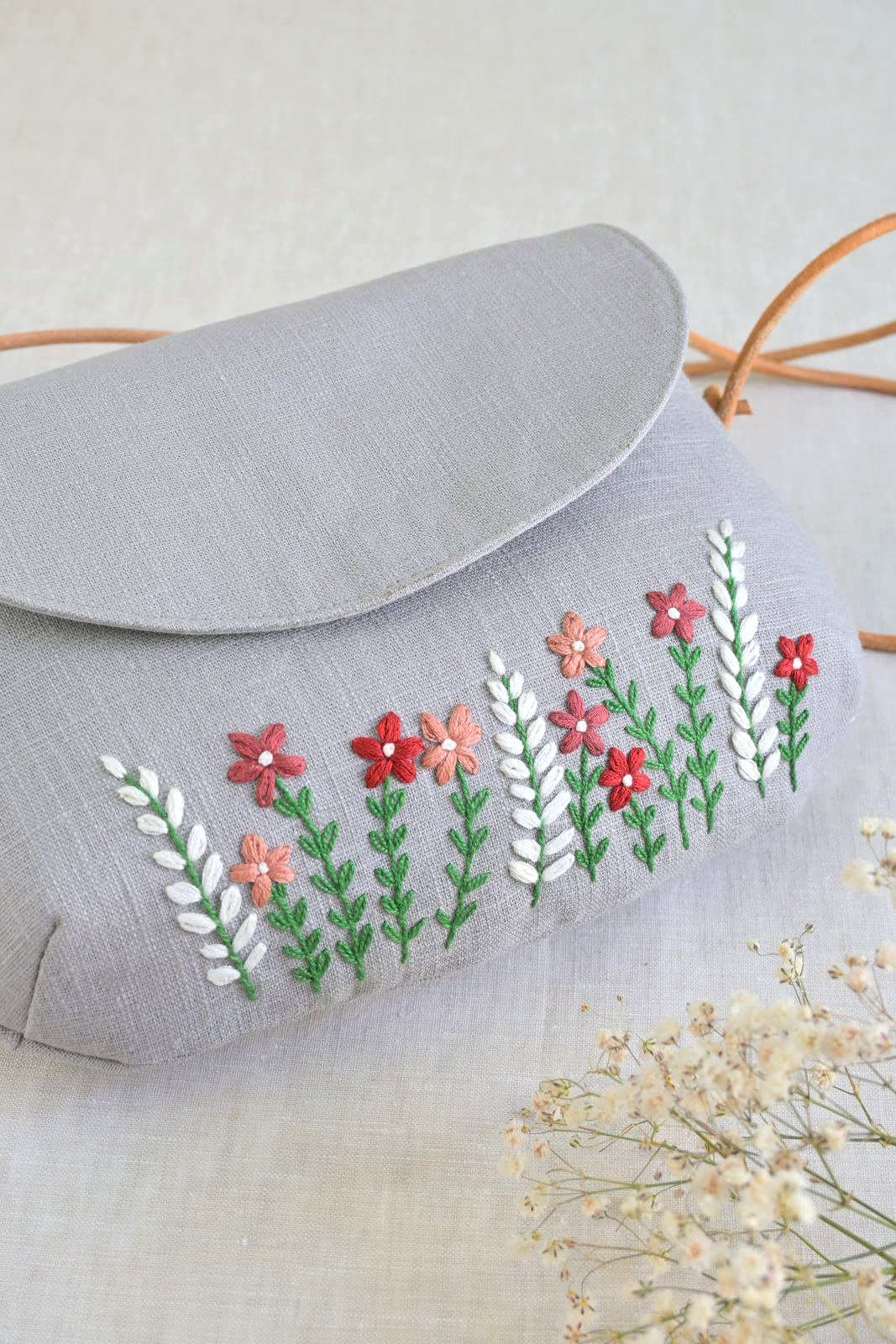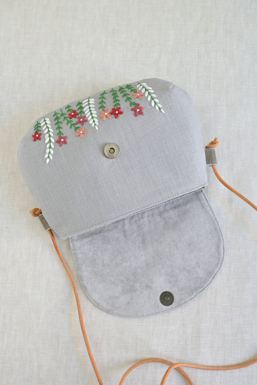 Na šedém podkladu jsou ručně vyšité stylizované kytičky v červeno-růžových odstínech. Protože výšivku nedělá stroj, ale lidské ruce, vzor se na žádné jiné kabelce neopakuje. Designová bavlněná podšívka z dílny Maywood studio ladí k vnějšku. Uvnitř nechybí praktická kapsička na drobnosti.
