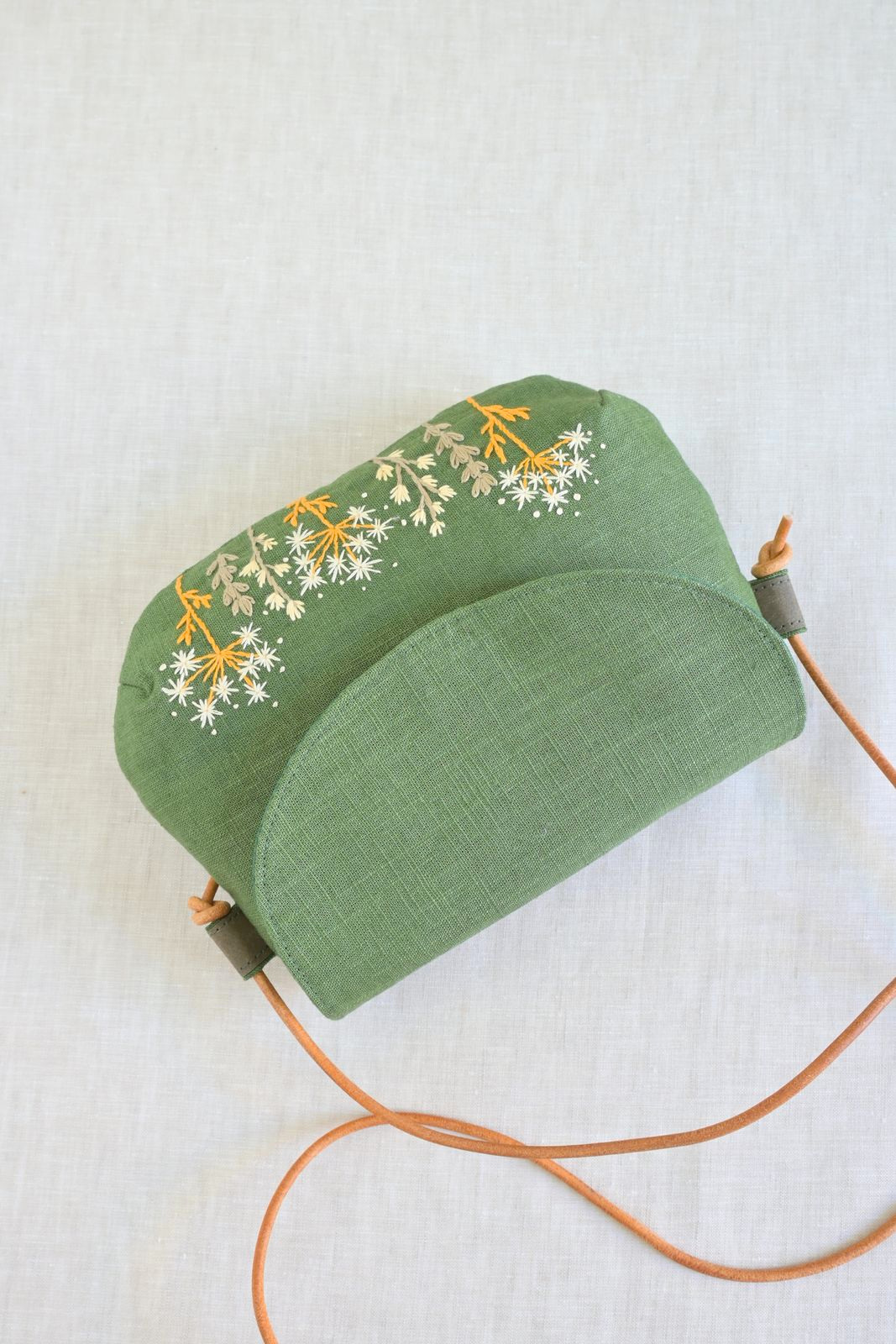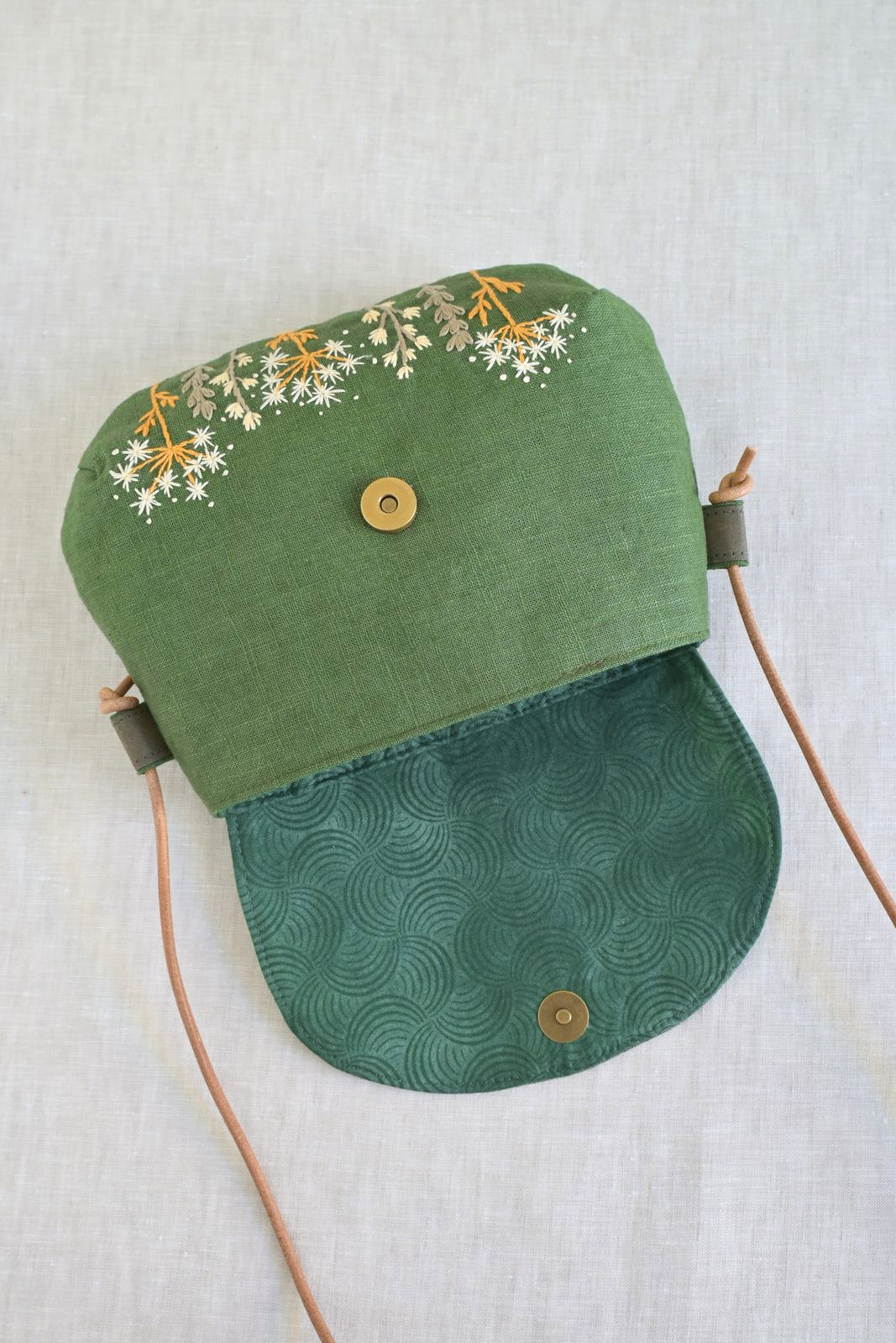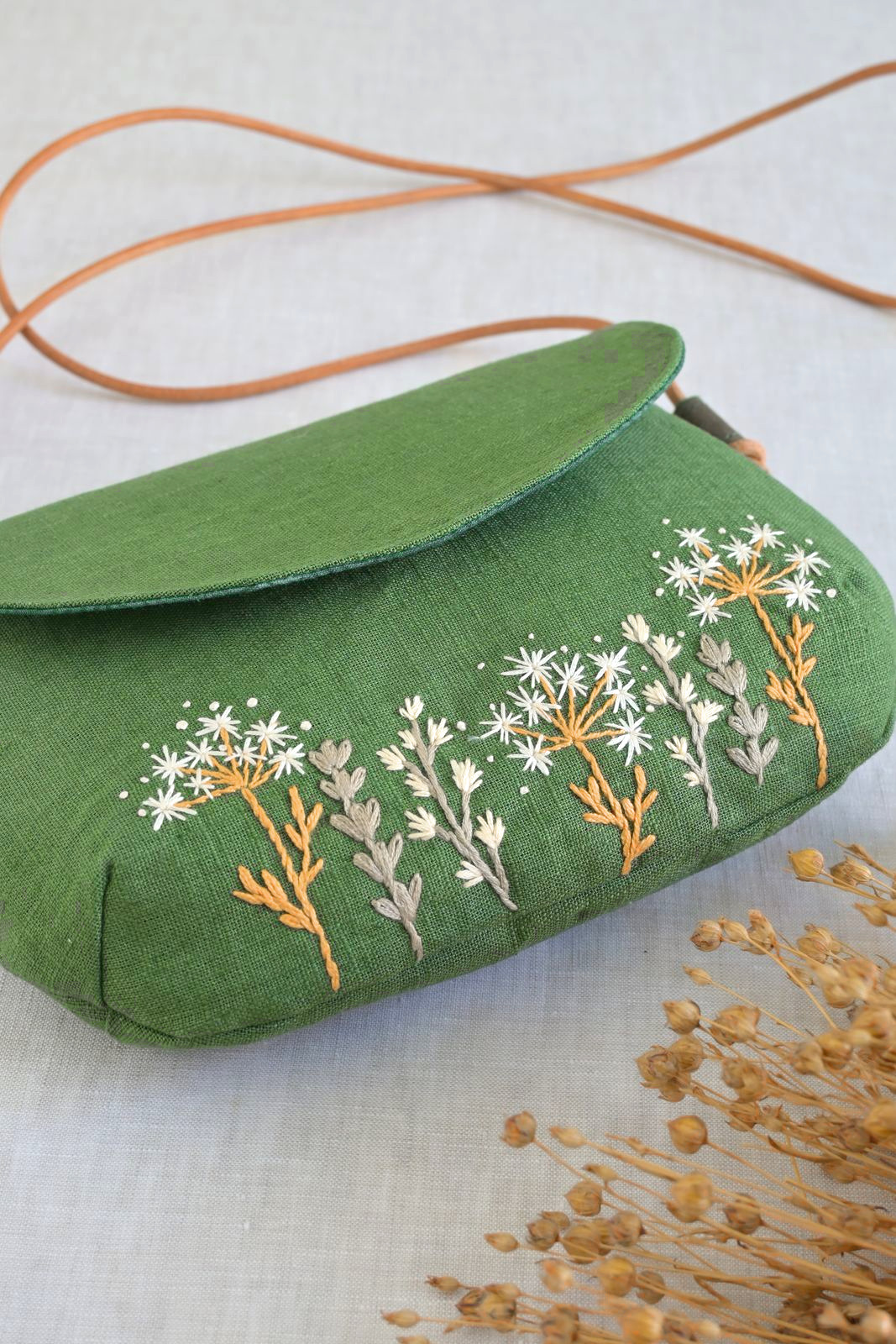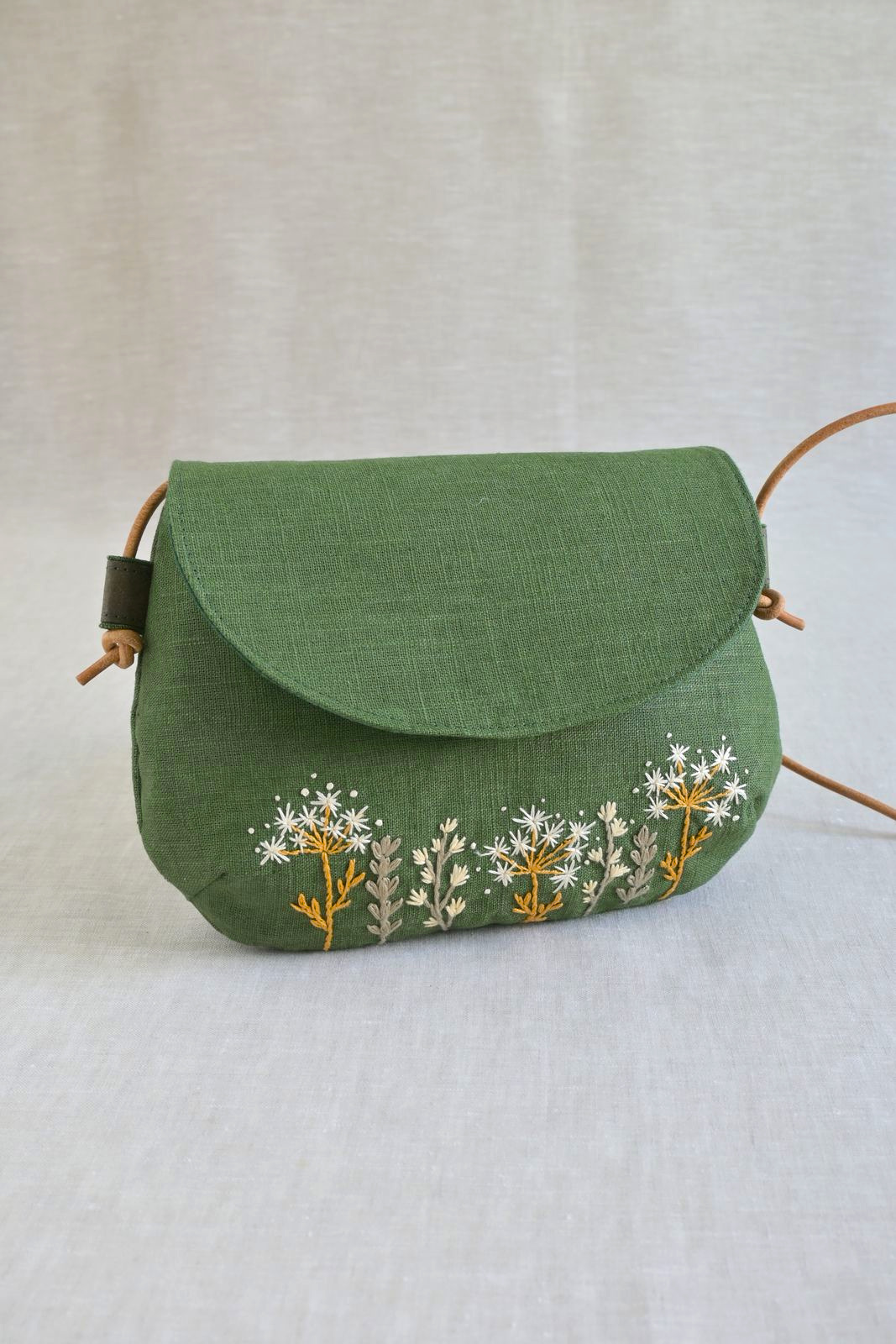Na mechově zeleném podkladu jsou ručně vyšité stylizované luční traviny v odstínech bílé, šedé a zlatavé barvy. Protože výšivku nedělá stroj, ale lidské ruce, vzor se na žádné jiné kabelce neopakuje. Bavlněná podšívka z dílny ladí k vnějšku. Uvnitř nechybí praktická kapsička na drobnosti.