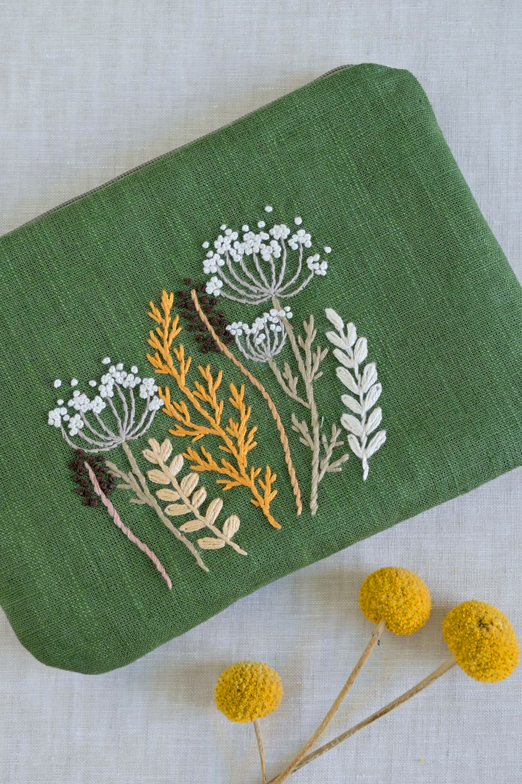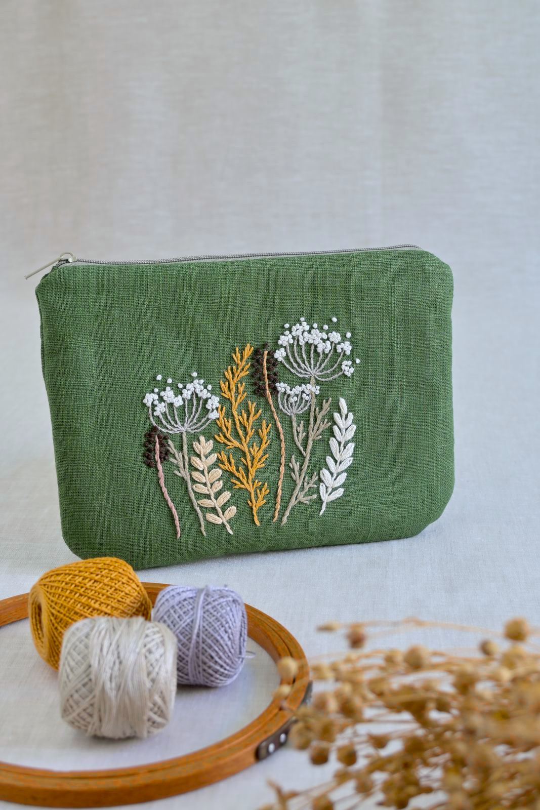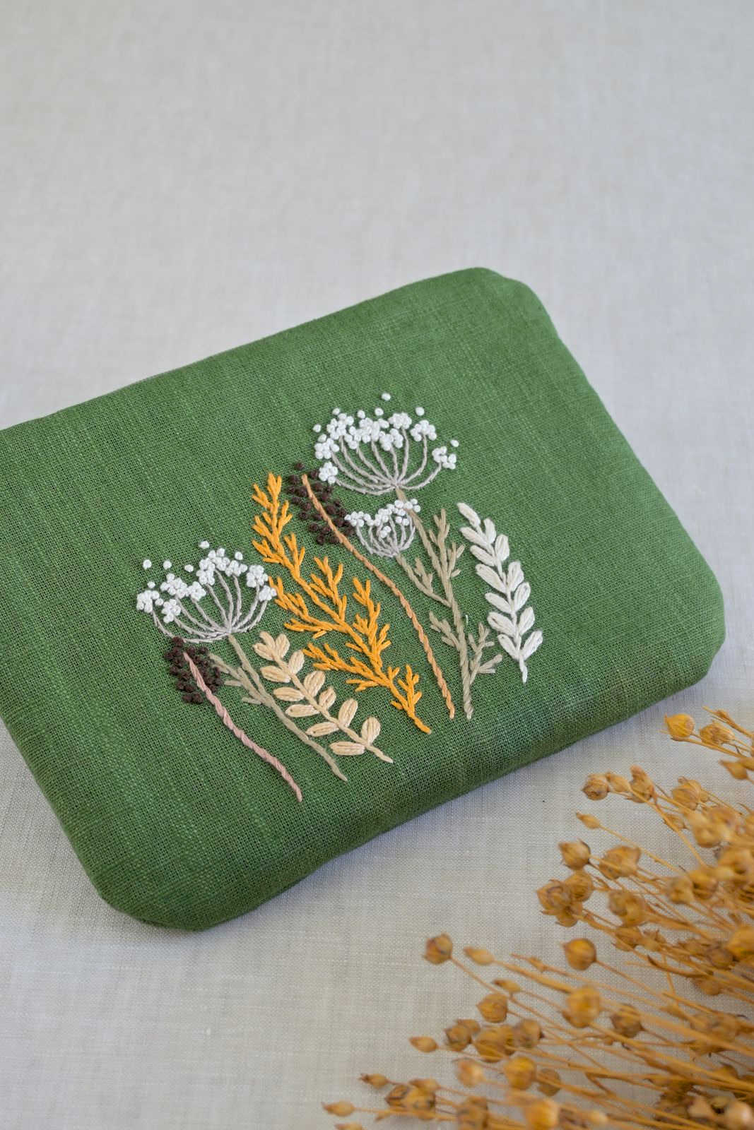 Zelená vyšívaná taštička s lučními travinami. Bavlněná podšívka ladí k vnějšku, díky výztuži hezky drží tvar.